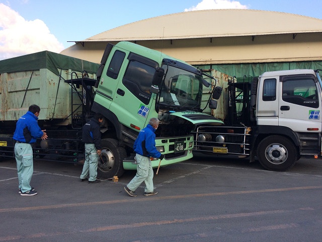 さてさて、今日は久しぶりに本社産廃物流チームの車両点検をパパラッチ(笑)しました。